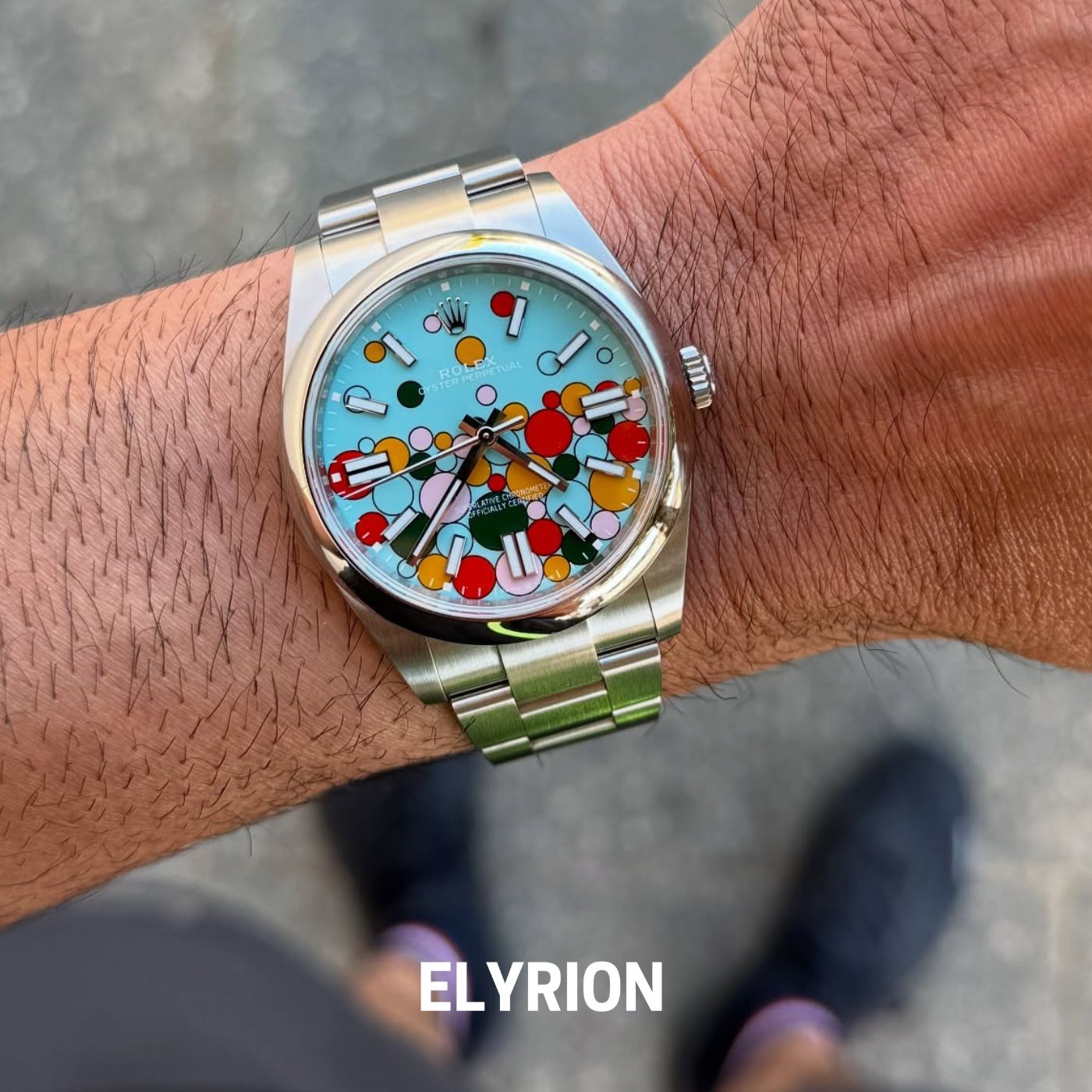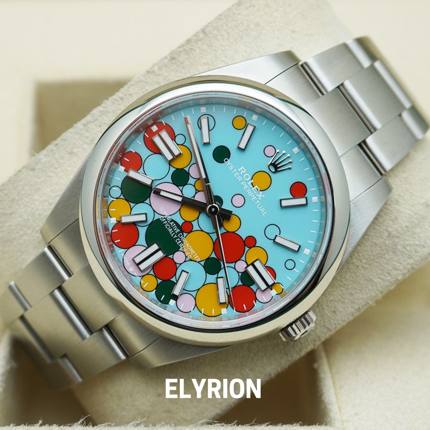 This 41mm Rolex Oyster Perpetual features a robust Oystersteel case with a screw-down crown and back, ensuring 100m of water resistance via the Twinlock system. Its domed bezel and scratch-resistant sapphire crystal frame a striking turquoise blue celebration motif dial with luminous index markers.